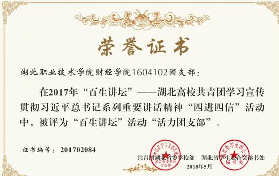 日前,开云kaiyun官方网站收到共青团湖北省委学校部、湖北省学联秘书处联名颁发的荣誉证书,1604102班团支部在2017年“百生讲坛”-湖北高校共青团学习宣传习近平总书记系列重要讲话精神“四进四信”活动中被评为“百生讲坛”活动“活力团支部”。