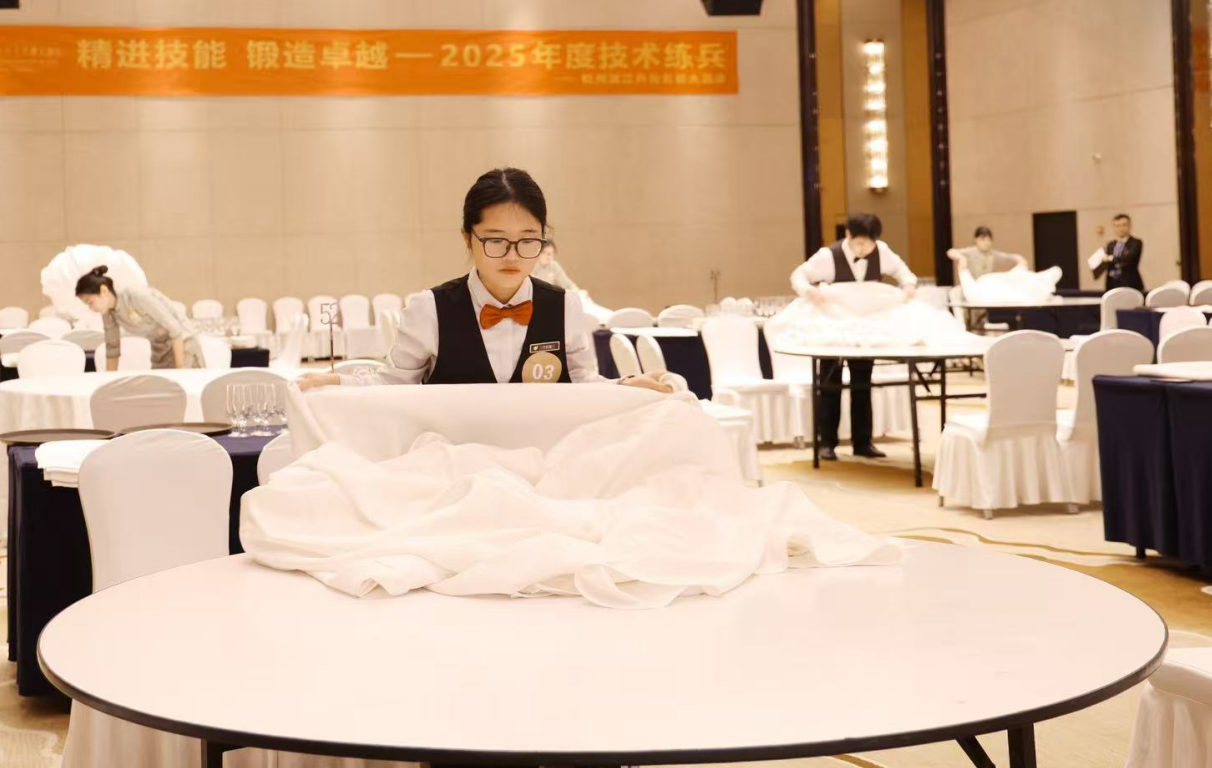 本次比赛中,23级酒店管理与数字化运营专业学生杨志文凭借细腻的操作与稳定的发挥,斩获摆台赛项专业组第二名。赛后,她难掩激动之情:“这份成绩是对实习期间学习成果的肯定,也激励我继续精进技能。”据悉,杨志文目前在中餐业务部实习,她坦言该岗位工作节奏相对宴会部更为舒缓,但依然需要严谨的服务意识与高效的团队配合。谈及在杭生活,她笑称:“杭州的繁华与便捷超乎想象,这里既有国际都市的活力,又不失江南水乡的韵味。”