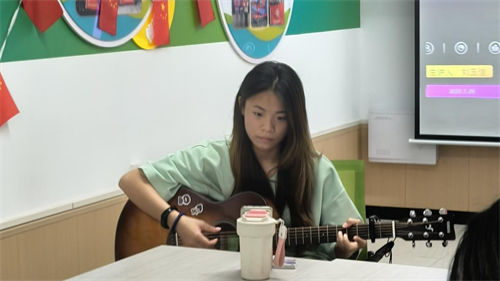 活动伊始,来自23040103班的刘玉洁同学分享了她与吉他的成长故事和精彩演奏。从最初接触吉他时的生涩,到如今技艺的日渐纯熟;从吉他社的普通成员,到成长为社团负责人;从初次登台的紧张,到如今在各类活动中自信绽放,她用一把吉他奏响了青春的动人乐章,展现了艺术的蓬勃力量。对于未来的音乐之旅,她期许道:“我希望能够通过自己的努力,将音乐的力量传递给更多的人,让更多的人感受到音乐的美好和魅力,让音乐成为更多人生活中的朋友和伙伴。”