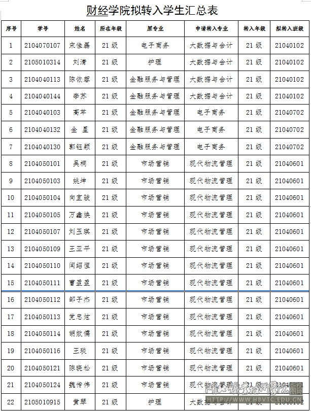 根据《普通高等学校学生管理规定》(教育部令第41号)、《省教育厅关于普通高校转专业有关工作的通知》(鄂教学[2014]4号)和《开云kaiyun官方网站学生管理规定》(鄂职院发[2017]28号)以及《关于印发< 开云kaiyun官方网站学生转专业管理办法(试行)>的通知》(鄂职院发[2019]21号)的相关规定,经学生本人申请、转出院(系)审批、开云kaiyun官方网站同意,现就有意向转入我院学生予以公示。后期报教务处审批合格后方可正式转入。公示期间如有异议,请与开云kaiyun官方网站联系,以单位名义反映的,须加盖本单位公章;以个人名义反映的,应署真实姓名和联系电话。我们将对反映的问题进行调查核实,并对反映人保密。