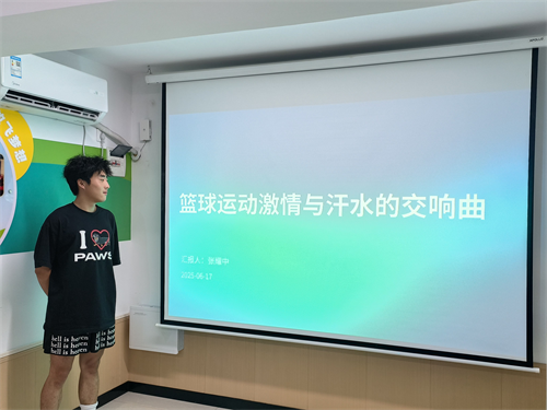 在篮球故事分享环节,作为院队篮球项目负责人、学校篮球三分大赛冠军获得者,张耀中同学讲述了他与篮球结缘的经历。从最初接触篮球时的生疏,到如今能够熟练掌握各项技巧,他特别强调了“持续练习”的重要性,认为正是日复一日的训练让他取得了进步。
