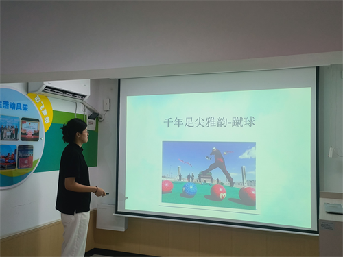 最后登场的田源同学为大家带来了关于蹴球的精彩分享。她首先介绍了蹴球这项运动的悠久历史及其蕴含的传统文化价值。随后,通过播放我校在2023年孝感市运动会上夺冠的比赛视频,不仅让同学们直观了解了蹴球的比赛形式,更生动展现了这项传统运动的独特魅力和技术难度。