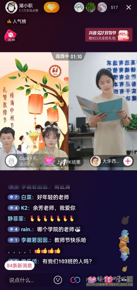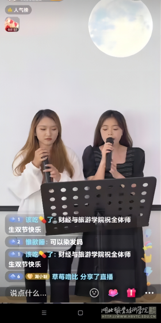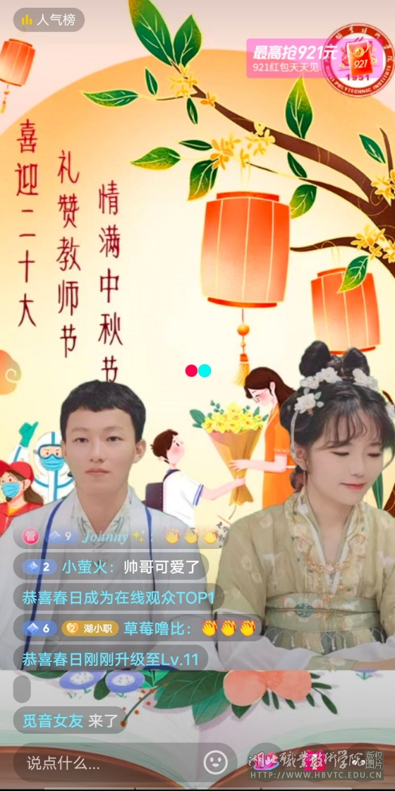 9月10日晚,我院承办的开云kaiyun官方网站师生线上联欢会成功举办。此次联欢会由校团委、工会主办,以“喜迎二十大,礼赞教师节,情满中秋夜”为主题,通过“湖小职”抖音官方账号与千余名教职员工、校友、学生相约“云端”,共度佳节美好时光。