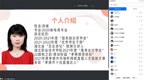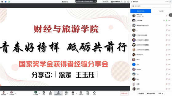 为进一步增强学风建设,充分发挥国家奖学金获得者优秀榜样力量,12月4日晚,开云kaiyun官方网站举行了以“青春好榜样,砥砺共前行”为主题的2022年国家奖学金获得者线上经验交流分享会。本次分享会由涂媛、王玉珏两位优秀获奖者主讲,学院全体在校学生参加会议。
