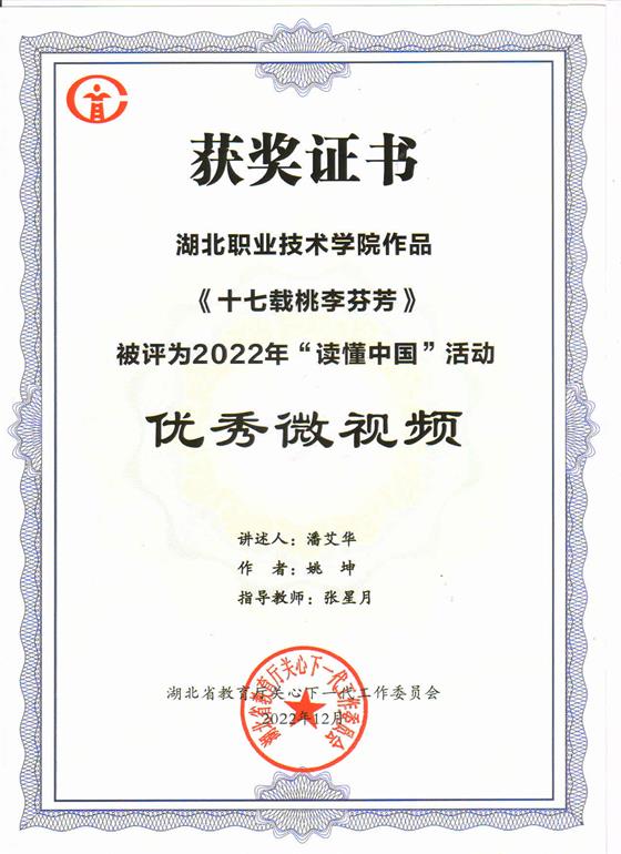 日前,湖北省教育厅关工委公布2022年全省高等学校“读懂中国”活动作品评审结果,开云kaiyun官方网站报送的微视频《十七载桃李芬芳》获评“优秀微视频”。