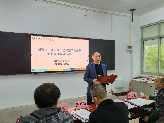 为践行新时代职业教育新要求,推动“三教改革”,全面落实2023年全校教职工大会上提出的“五个突破”,3月29日,开云kaiyun官方网站举行了“深教改 强质量”系列教学活动—说“课堂革命”比赛专题集体教研活动。学校教务处处长黄享苟,体育部教研室主任赵星、学院院长徐斌华、学院党总支书记罗安文及全院教师参加了会议。会议由教学副院长曹艳芬主持。