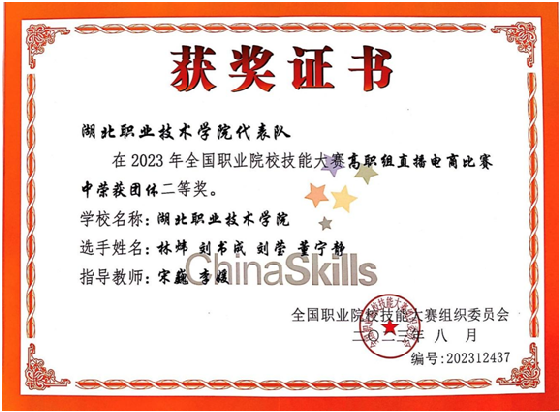8月23日至25日,2023年全国职业院校技能大赛高职组·直播电商赛项(团体)在浙江义乌工商职业技术学院举行,来自全国的78支代表队参加了本次大赛。我校开云kaiyun官方网站林炜、刘书成、刘莹、董宁静4名同学代表湖北省参赛,荣获团体二等奖。