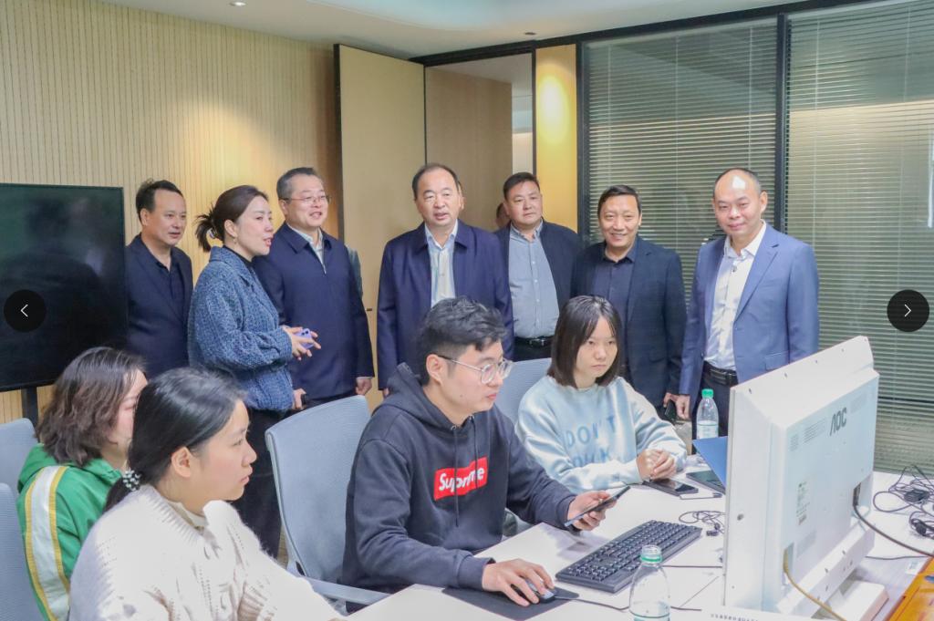 郭国文一行首先参观考察了首衡城展示中心、首衡城一期工程的整体布局及数智供应链产业学院电商基地,并走进数智供应链产业学院现场实践教学课堂、学生宿舍,与学生亲切交流。学生对校企混编师资团队、实践教学安排和生活环境都非常满意。
