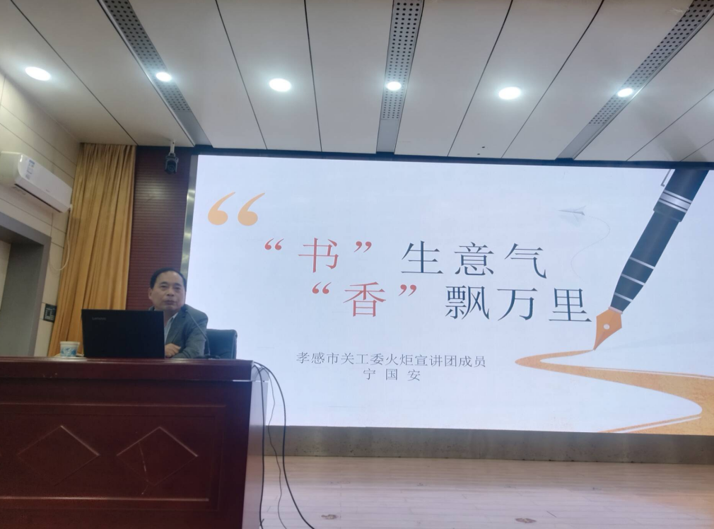 随后,市关工委“火炬”宣讲团宣讲员宁国安为师生做了题为《“书”生意气“香”飘万里》的报告。宁国安是孝感市政协理论研究会副会长,荣获湖北省人民政府第九届湖北省高等学校教学成果奖等诸多奖项。宁国安结合自身经历和校园征文活动,用丰富的案例,从写作创作的概念、意义、途径三个方面对写作创作进行了的讲解。他表示,写作创作要做好思想的表达、做实七个步骤、坚定内容为王,并鼓励同学们坚持读书学习,提升写作创作技巧,为未来美好生活奋斗。